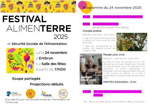Lundi 24 novembre à la salle des fêtes d’Embrun, 4 associations locales organisent une soirée autour du thème de la Sécurité sociale de l’alimentation. Autour d’un repas partagé, 2 documentaires seront projetés suivis d’une discussion :